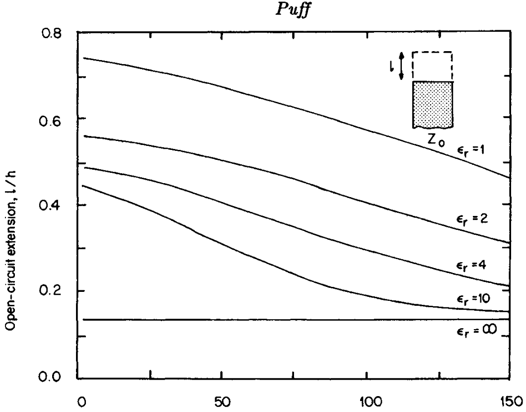 where ‘h’ is substrate thickness. The value, ’ere, referenced in (Hammerstad and Bekkadal 1975) (which is out of print), is vague, but there is a chart (See Table 7.2 below) in Chapter 7 of the PUFF manual which allows determining length correction ratio, given Zo and er values, and is much easier than the above formula. Then the extension, \(\ell_{eo} = \frac{ratio \times dielectric}{2}\) for the half value.