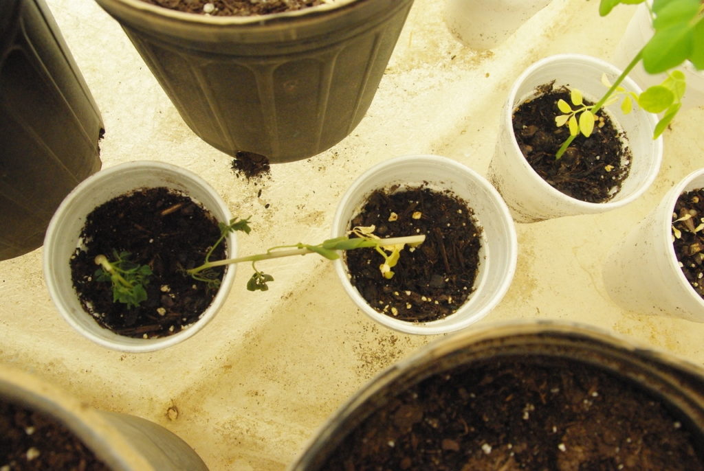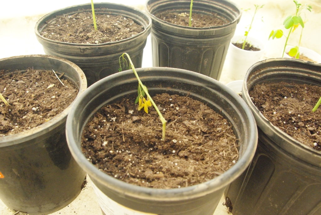 The one on the left in the above picture is the first one I transplanted to a larger pot. The larger volume of soil will absorb more heat and retain it longer than the ones still in little Styrofoam pots. The other sprouts, even some in large pots, are not doing well.