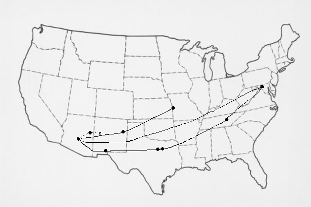 Firstly, it was received at FedEx in Kansas City, MO, where it then migrated to Tucumcari, NM, then on to Phoenix, AZ. So far it makes perfect sense. At that juncture, logic would have it travel by the dotted route on the above image to its destination.