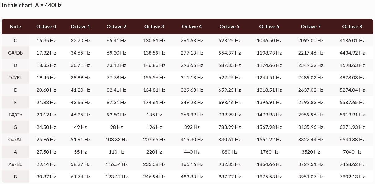 Looking at the above chart, notice in octave #4 the Middle C frequency of 261.63 Hz. The reference frequency for most musical instruments is 440 Hz, the A4. This chart is useful mostly for luthiers and others that construct musical instruments. A normal 88-key piano keyboard has at the lower end the A0 (27.50 Hz), and at the upper end, the C8 (4186.01 Hz), for a total of eight octaves. Each octave has the notes A through G.