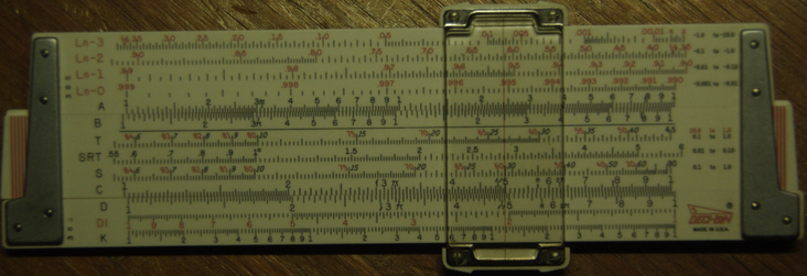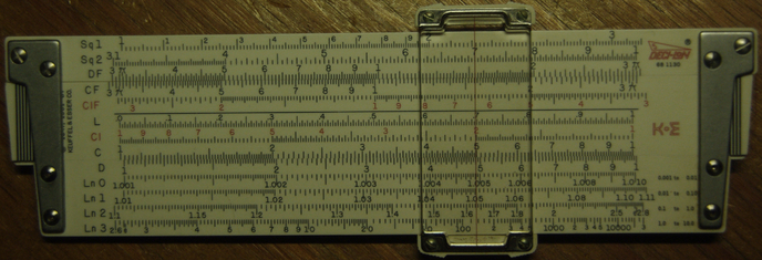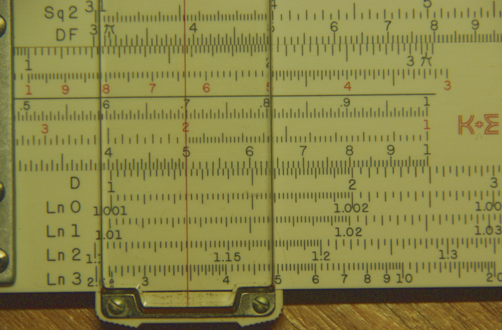I may have mentioned in previous posts about doing something with this particular slide rule, and here it is! This time I think I will explore a bit with logarithms, natural and common. The K&E Deci-Lon has the usual four sets of scales, called Ln 0, Ln 1, Ln 2, Ln 3; and their reciprocals, Ln-0, Ln-1, Ln-2, Ln-3.