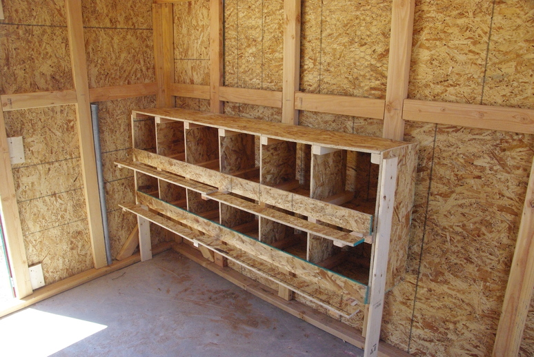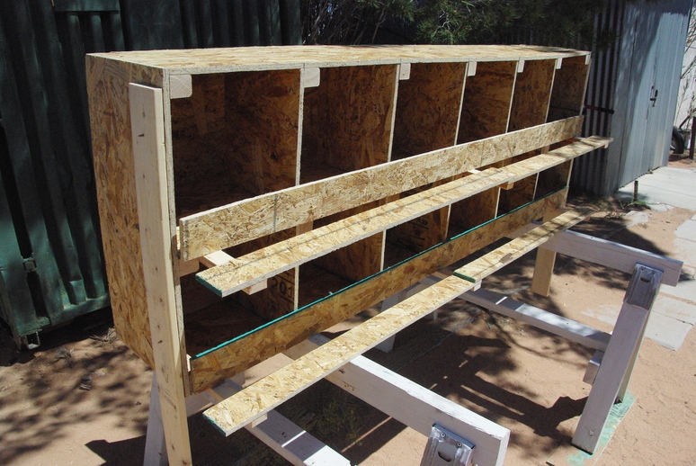 After searching for scrap materials, we came up with enough to build a double row nest box with six nests on each layer (no pun intended).