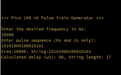 cout << "\n\n*** Pico 100 nS Pulse Train Generator ***\n" << endl;