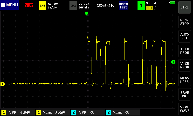A 1 is the high pulse and a 0 is a low. The three zeros surround a lone high, followed by the rest of the pulse train. Each pulse, low or high, is about 100 nanoSeconds wide. Adding a sleep line inside the for() loop would allow variation of pulse widths. There is no function in the FNIRSI Tablet portable oscilloscope to limit the bandwidth, so the signal is rather noisy. I also notice the o’scope picture taking function wraps the image, making it unusable.2 But that’s for another post, perhaps. You get what you pay for (and sometimes you don’t), especially from China!