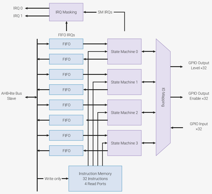 Each PIO instance includes four state machines that can each run instructions stored in shared instruction memory. This memory can hold 32 instructions, and each state machine can utilize any of the instructions. Each state machine can also control any of the GPIO1 pins on the Pico. Way overkill for my simple application, but extremely handy! Firstly, we create the simple assembly program to load into the state machine.