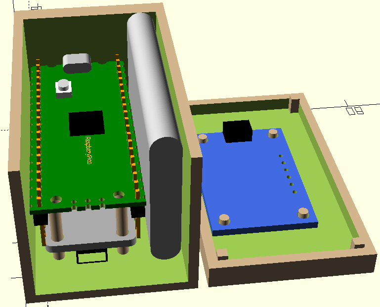 At the bottom of the above image is the BME280 sensor facing downward. Holes are placed in the bottom of the box for atmosphere ingress. Also mounted to the underside of the Pico board was the LiPo shim mentioned here, and seen in the below image. The box was made a bit wider to enclose the battery.2 As the battery is about the same length as the Pico board, it worked out nicely. Notice the small pushbutton on the front of the LiPo shim used to provide power to the Pico, sensors and display. By plugging the micro-USB cable into the Pico jack (seen atop the Pico board), the board can be placed in mass storage mode by simply holding down the BOOTSEL botton on the Pico, then pressing the LiPo power button twice. No cable connecting/disconnecting required.