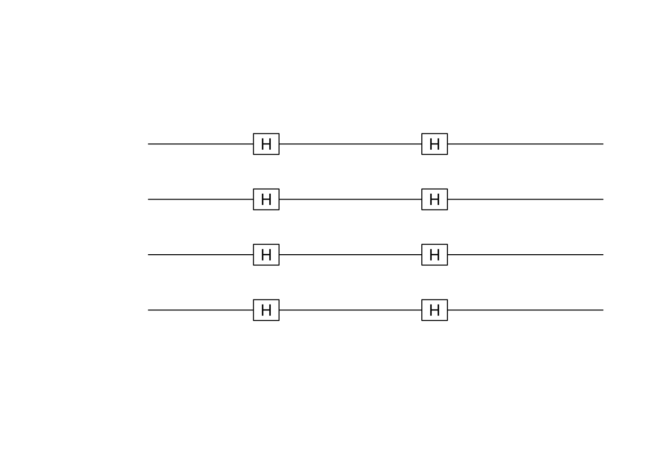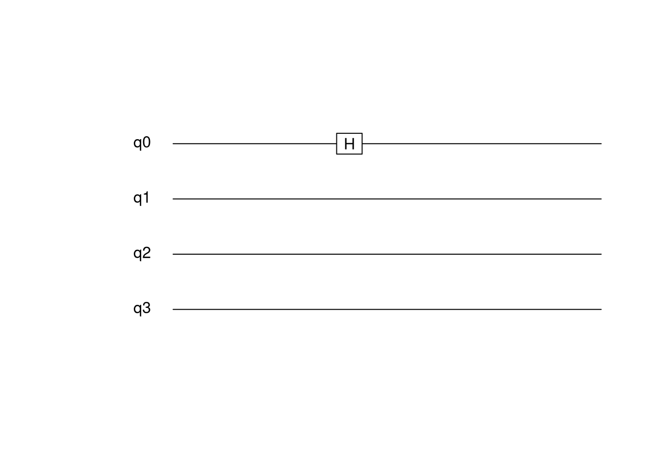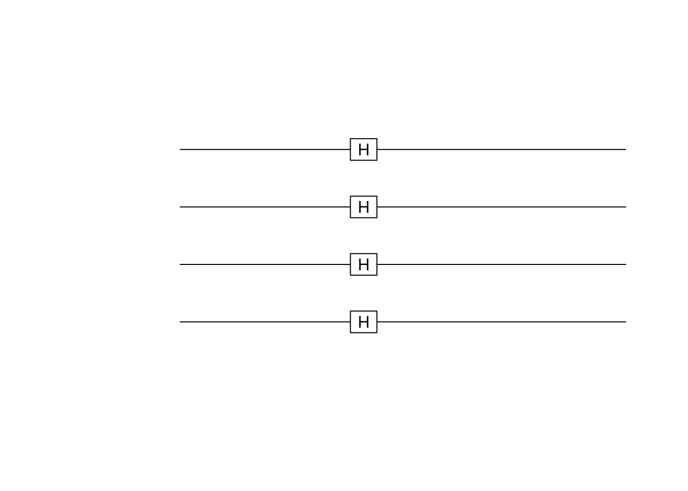 As the Hadamard gate acts on a single qubit, to perform a Hadamard transform on the 4-qubit ket0, we could use ket1 <- H(4) * (H(3) * (H(2) * (H(1) * ket0))) for the 4-bit superposition with the circuit diagram below that,