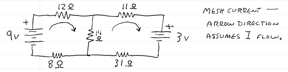 The method I will attempt is to tie into the following electronics problem for a more real-world application of matrices, as I also have done in The Matrix post. Suppose we have a somewhat trivial circuit which we must determine the current flow and direction. Such a circuit is depicted below.