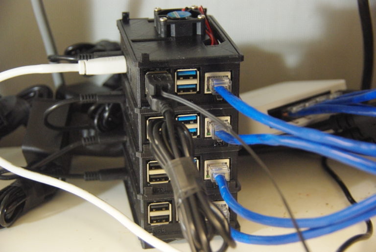 The first hurdle was coming up with a case to contain the four Raspberry Pi 4s that I am using here. Each Pi 4GB SBC has the latest Raspbian Buster (as of 10 November, 2019), and I have set each up as CLI login to keep things cooler (although I am not sure this makes much difference in temperature). There are a LOT of cases for Pi clusters sold, but as I have a 3D printer, I decided to try the homemade variety. I found a Pi 4 Stacking Case by Stephen Jogerst that I decided to use. I printed out four middle sections along with a top and bottom. I had to flip the top section to make it easier to print, thereby eliminating lots of support material. Other than the snap-together tabs, it is working great. The tabs are a bit delicate (with PLA), and require a light touch during assembly.