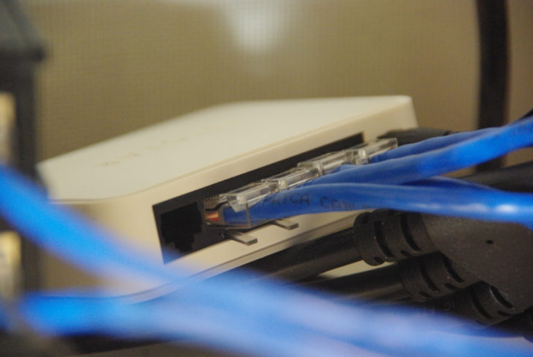 Using an unmanaged Ethernet switch for communication allow all the nodes to talk. I made up short (~12”) cat-6 cables for connection. It is way cheaper to make up patch cables than try to find the really short ones I needed here.