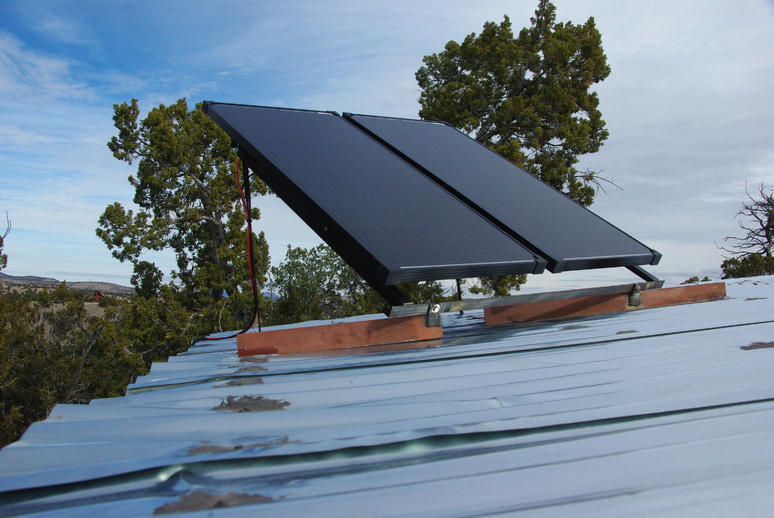 The final step was building the mounting brackets for the two solar panels, which are mounted to the roof. The solar panels are tilted to the same angle as our latitude, with zero being the horizontal starting point, and oriented pointing due South. At this point we realized we had no nuts and bolts to mount the panels! Der! So we had to wait an additional week for appropriate hardware. After that, it was fairly simple to weld up some brackets.