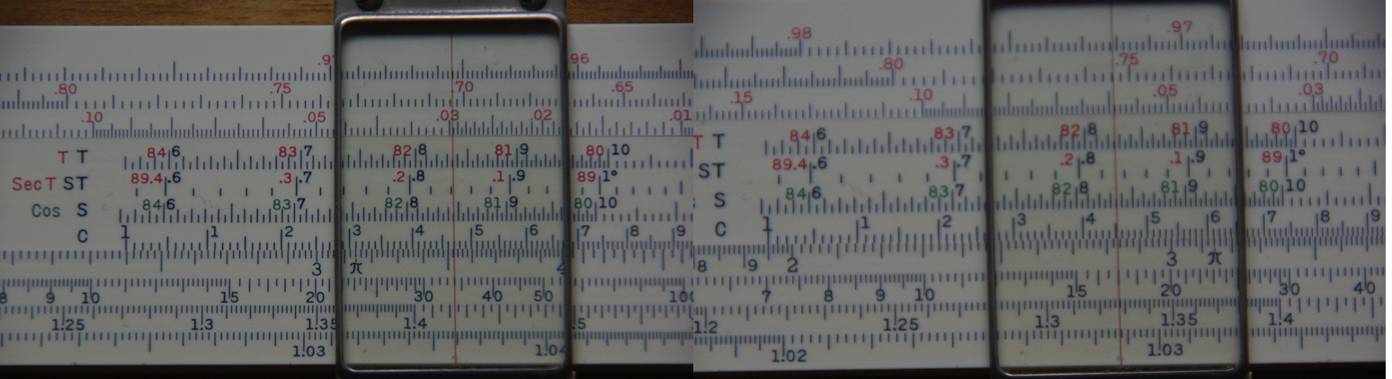 Anyway what’s nice about these scales is the decimal point is usually given by the scale reading, making it unnecessary to determine its location. But, it is necessary to ensure the actual reading, as the scales subdivisions change frequently. This is caused by the large range the scales cover, usually from about 0.00005 to a bit over 22,000. The numbers on the log log (LL) scales represent powers of e. All the LL scales are on the body, as is the D scale, so the powers can be read by simply setting the hairline (HL). So, if x represents a number set on the D scale, the value of ex is found on the LL scales. The LL0, LL1, LL2, LL3 are positive scales (i.e., ex), and LL/0, LL/1, LL/2, LL/3 scales (or -LL0, -LL1, -LL2, -LL3) are reciprocal scales for negative powers (i.e., e-x).