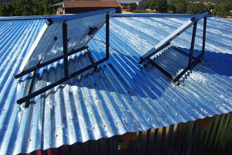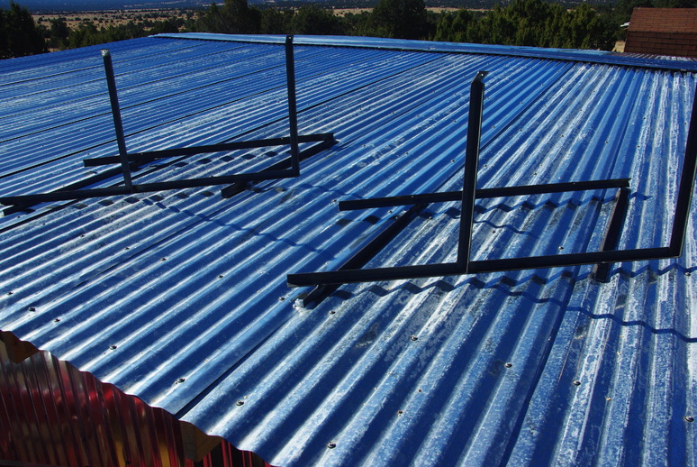 The brackets are now welded and ready to go onto the roof. Although they look a bit weird, they are angled to point mostly south at a vertical angle of 34 degrees, the best compromise for all year sun. As mentioned earlier, I used 1/4” lag screws to screw the brackets into the rafters beneath the tin. Then silicone sealant was used to cover the screw heads and in the joints between the brackets and tin.