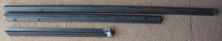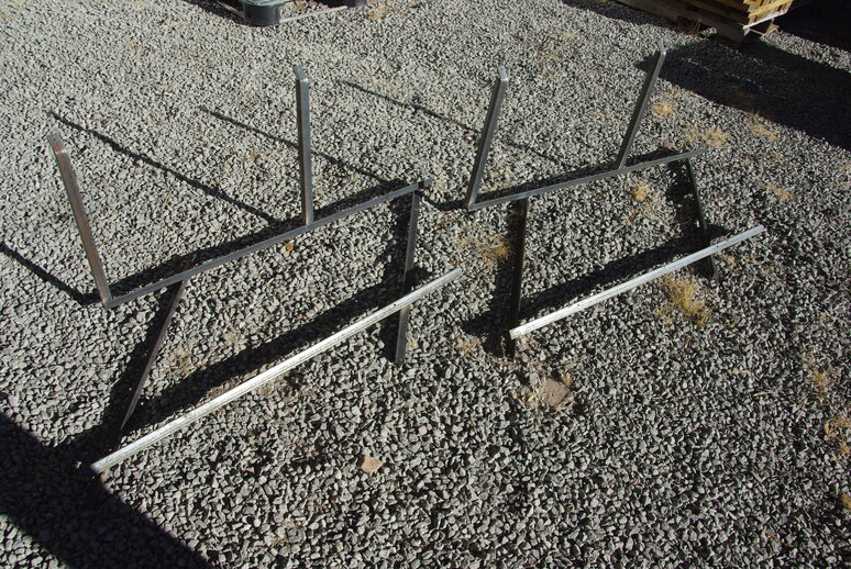 The above brackets, already drilled for assembly, will be installed on the roof. Three-inch lag screws will fasten the base brackets (the medium 1” angle iron) to the rafters, with silicone caulking between for a waterproof join. Then the shorter bent brackets will bolt to the upper side of the solar panels, and the longer angle irons to the bottom. Then comes the welder to join the loose pieces together.