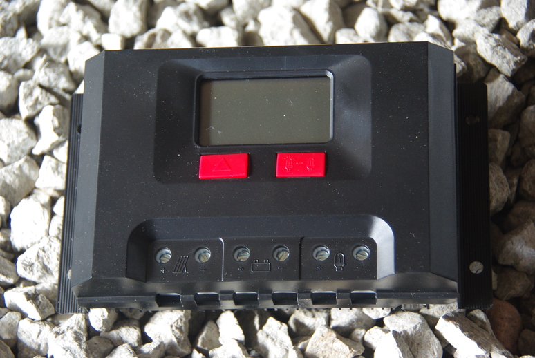 The 30 ampere charge controller, shown above, will regulate the input to the batteries. After we acquire some nuts and bolts, we will assemble the steel frames for the two solar panels. We want to ensure the lag screws hit the rafters for a solid mount to maximize wind resistance, so we will most likely have to build the brackets a piece at a time, especially the base. Then we will attempt to weld the other frame pieces onto the mounted base angle iron. Custom construction indeed!