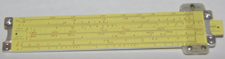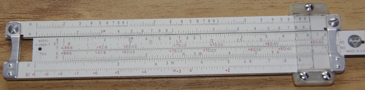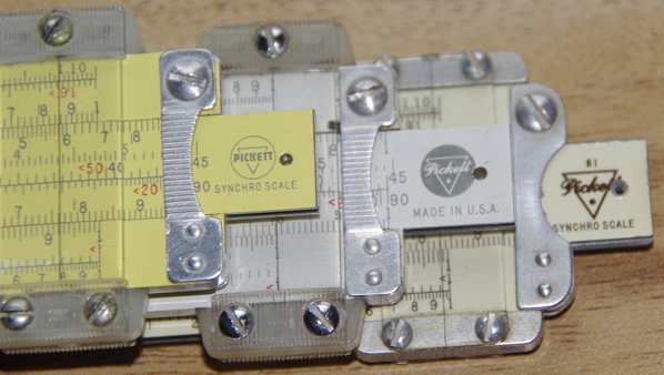 This particular slide rule appears to have been manufactured around 1958, going by the rounded stamped aluminum ends and bars, but especially the logo on the right slide end. Unlike the Hemmi and Post slide rules, it is sometimes a bit difficult to get close to an exact date for Pickett rules.
