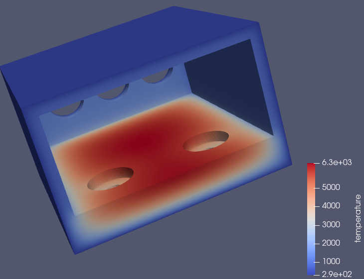 This particular simulation is a simple heat distribution equation starting from room temperature (293oK/68oF). The scale shown on the lower right may be off, as 6300oK seems a bit warm. That’s 10,800oF. So I think some value is wrong in this example…