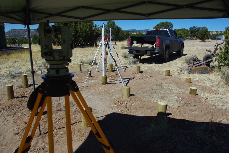 Notice the theodolite (a Pentax TH10) is set up under a canopy. This is an important step for sunny days! If the sun shines on the transit, the level bubbles have a tendency to move toward the hot end of the level, making it very difficult to level the instrument with any accuracy, or keeping it accurate for any length of time!