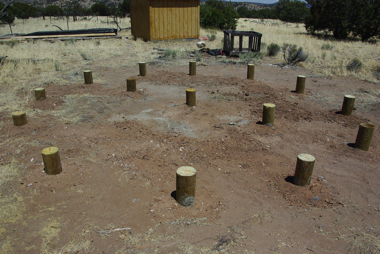 The small yurt we are keeping, perhaps as a guest room. The larger 30’ yurt we sold. So, depending on acquiring the materials we need (4x6 beams, etc.), we will create a new support and floor for the 16’ yurt. With that in mind, we dug the holes, lots of holes!