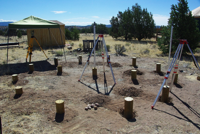 All the support poles are sections of 6-8 inch electric poles, pressure treated for ground contact. We first started with the center pole, where we dug down at least 18 inches to get below the frost line for this region. However, this hole is about 24 inches deep, as it is also the tie-down point for the yurt. As we wanted the floor to be ~10 inches above the ground all around, we cut the pole accordingly. This pole is now the reference point for all the other poles. As seen below, setting up a theodolite (transit) to measure the height, we could then determine each pole’s required length, regardless of the hole depth. This would ensure all poles would be level with the center and each other.