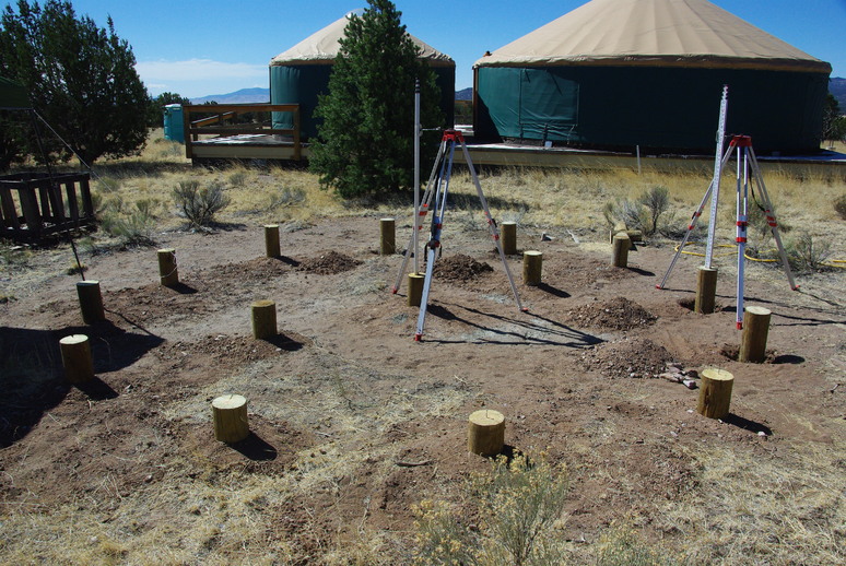 The yurt to the left in the above image is the one to be transplanted. The connecting hallway is already removed. Also seen, all the poles are cut and awaiting concrete to fill the holes and stabilize the posts. The last image shows all completed poles in place, the site cleaned up and all the instruments/tools put away.