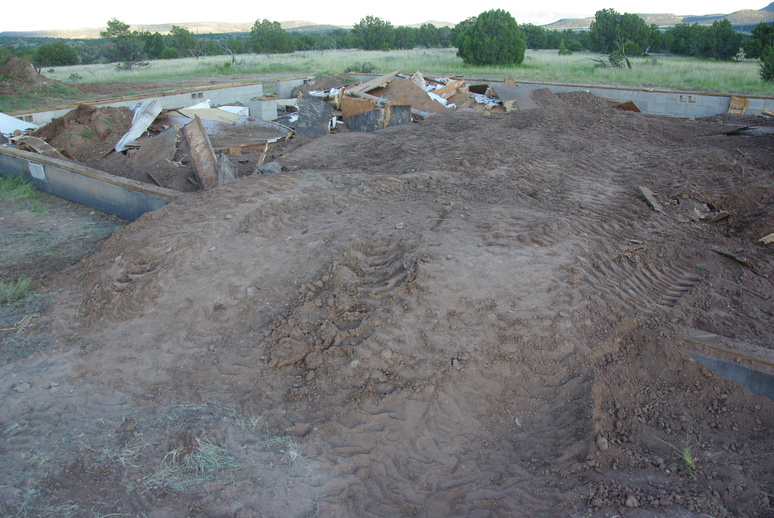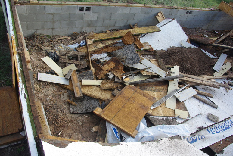 We toyed with the idea of renting a waste container for the refuse, but found it too expensive as the transportation distances and associated costs were prohibitive. So after realizing there was plenty of space inside the old foundation, the solution was simple. We place the waste in the hole, and cover it up!
