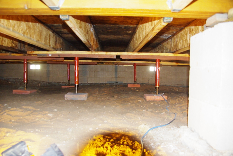 One solution we tried was placing jacks under the I-beams. That helped for a while, but was really just a band-aid that put off for a while a major job. The above image clearly shows water damage on the sub-floor.